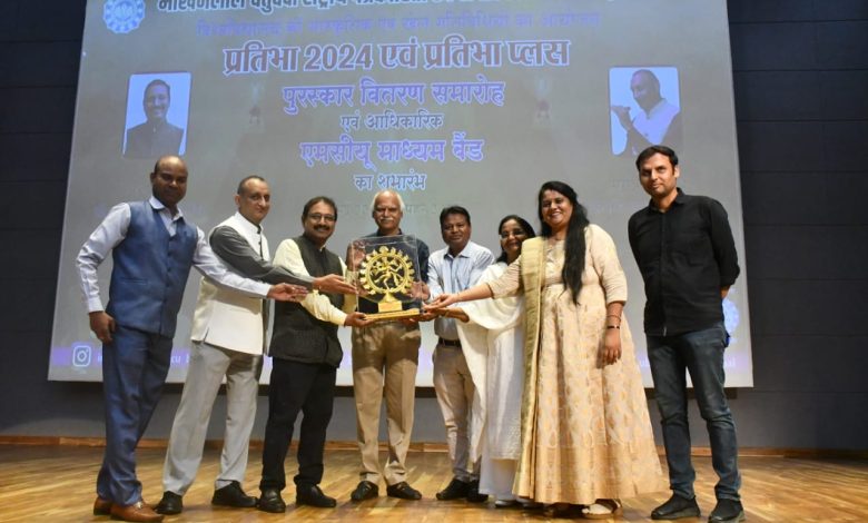 भोपाल: माखनलाल चतुर्वेदी राष्ट्रीय पत्रकारिता एवं संचार विश्वविद्यालय ने ‘प्रतिभा 2024’ और ‘प्रतिभा प्लस’ पुरस्कारों के वितरण के साथ ही अपने नवीन ‘एमसीयू माध्यम बैंड’ का शुभारंभ किया। इस भव्य समारोह में विद्यार्थियों को प्रमाण पत्र, ट्रॉफी और मेडल प्रदान किए गए।